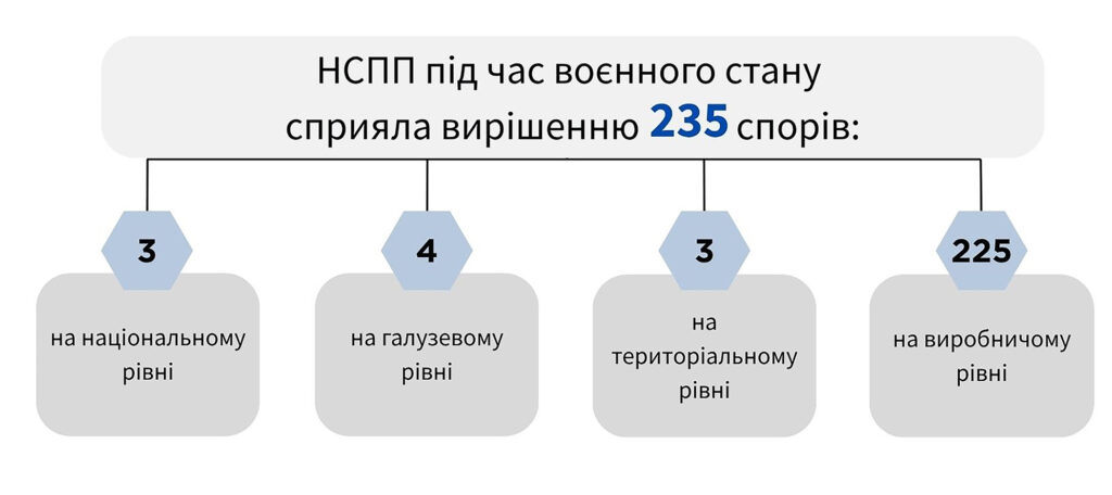 Крім того, НСПП протягом 2023-2024 років працювала над фундаментальним і важливим законопроєктом «Про колективні трудові спори». Він має на меті осучаснити організаційно-правові засади, форми та методи вирішення колективних трудових спорів в Україні, запровадити сучасний механізм вирішення таких спорів за допомогою примирних процедур та трудової медіації, удосконалити інститут трудового арбітражу, уточнити повноваження та функції НСПП, удосконалити порядок та процедури оголошення страйків і локаутів, збалансувати інститут відповідальності та інтереси працівників і роботодавців у сфері акцій протесту тощо. Нині проєкт закону №12034 «Про колективні трудові спори» очікує на розгляд Верховною Радою.