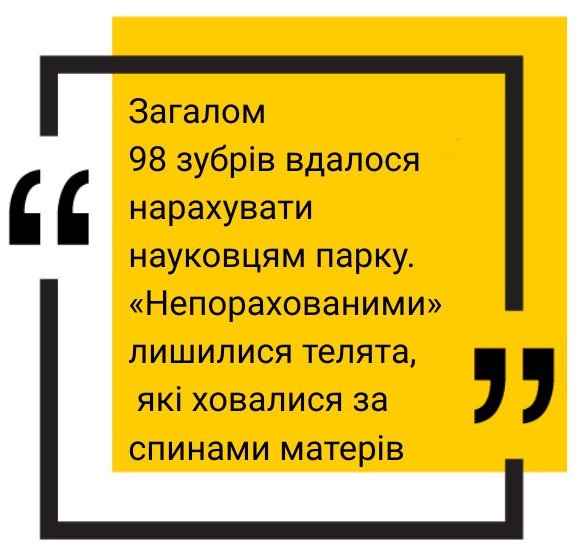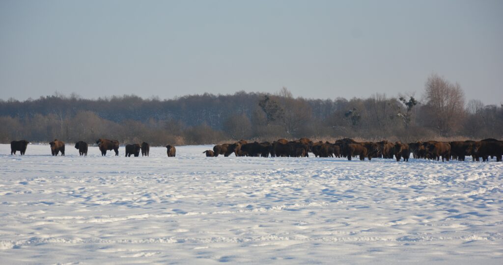 Цьогоріч, сфотографувавши поголів’я, я нарахував у стаді вже 98 особин, не враховуючи певної кількості маленьких телят, які ховалися за своїми мамками. У пошуках їжі зубри вийшли на поле між селами Лагодів, Мідне та Берлин, на якому фермери залишили незібраною сою. За слідами стада можна бачити, що тварини не мігрують лісами, а тримаються поруч із цим полем. Судячи з посліду, якого на полі дуже багато, зубри не голодують.