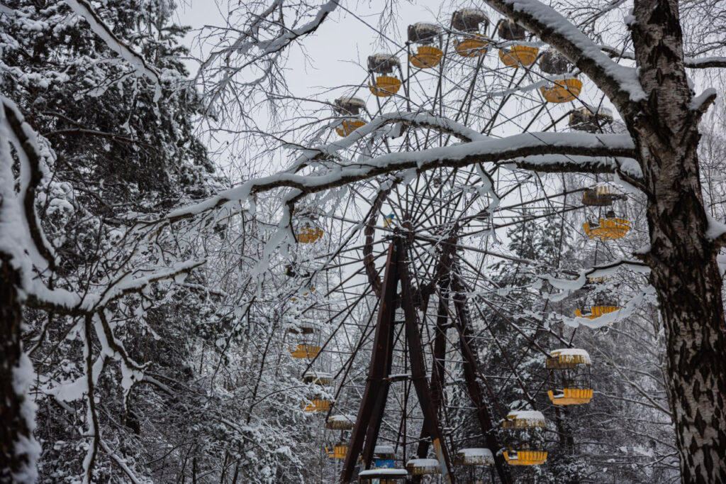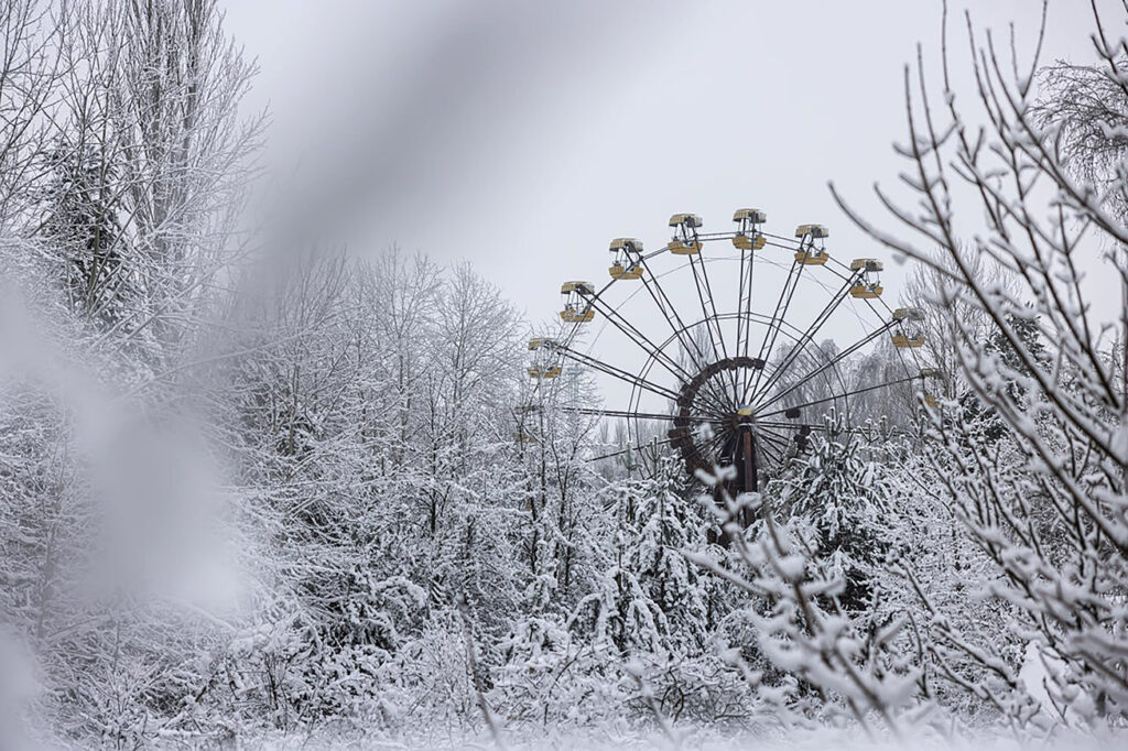 Колесо огляду, відомий на весь світ і впізнаваний символ нездійсненних мрій жителів м. Прип’ять, стоїть серед заростей дерев і чагарників, мов годинник без стрілок. Його кабінки — жовті плями пам’яті — визирають крізь гілля, припорошене інієм. У цій непорушній засніженій тиші є щось заспокійливе: зима ніби примирює метал і дерево, бетон і мох, минуле й теперішнє. Тут усе зупинилось, але не померло.